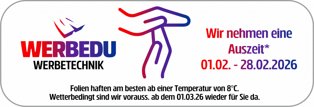 Du brauchst kurzfristig eine Schaufensterbeschriftung, eine Fahrzeugbeschriftung, einen Sichtschutz mit Spiegelfolie oder ein neues Werbeschild? Wir kommen vorbei, messen aus, gestalten einen Entwurf und machen Dir ein faires, unverbindliches Angebot.